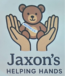 Graphic of hands holding a stuffed teddy bear. Text reads Jaxon's Helping Hands.